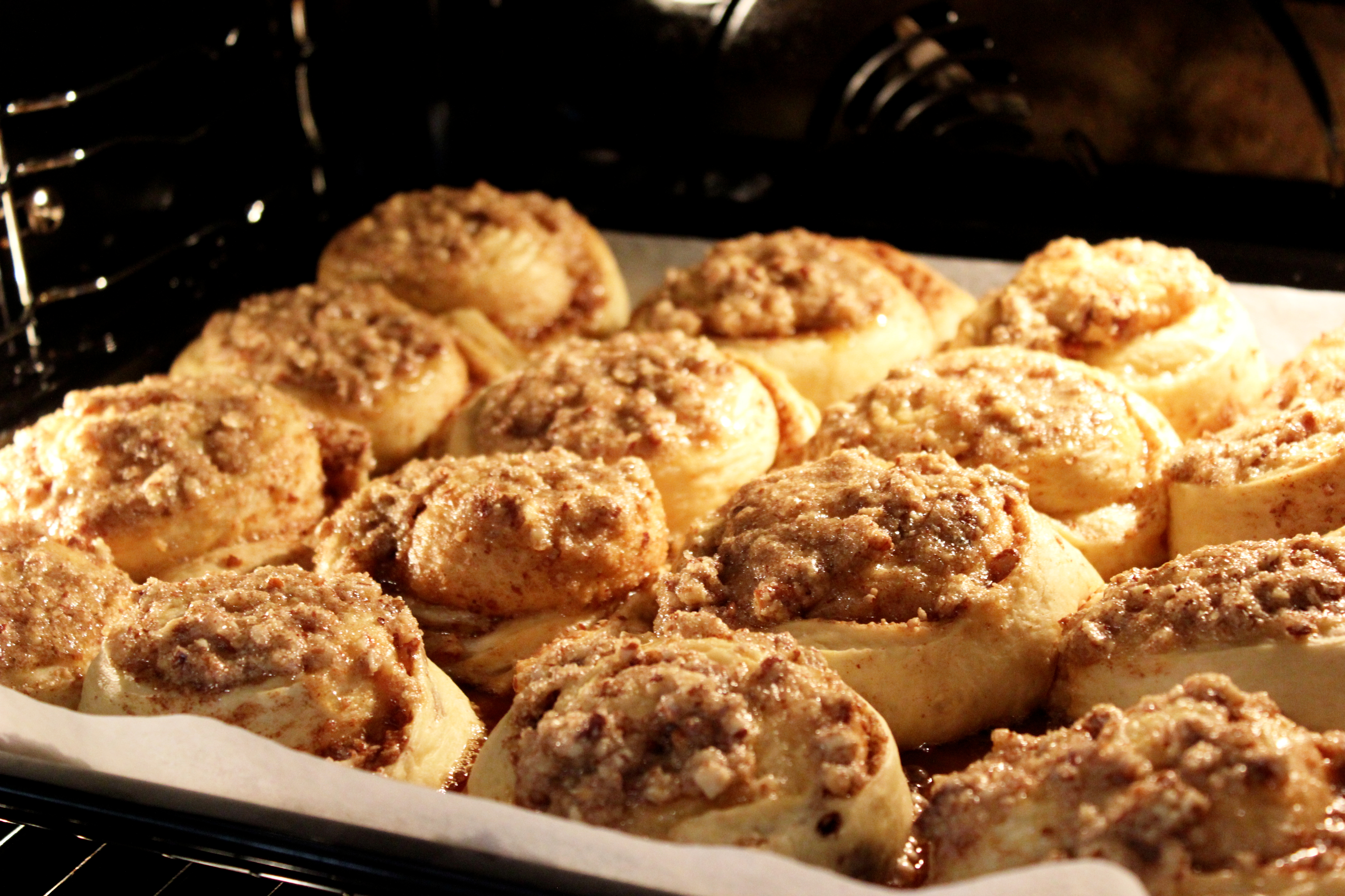 Die zerlassene Butter gleichmäßig verteilen, dass alles bedeckt ist und nun die Zimt-Zucker-Pakansmischung ebenfalls gleichmäßig aufstreuen.