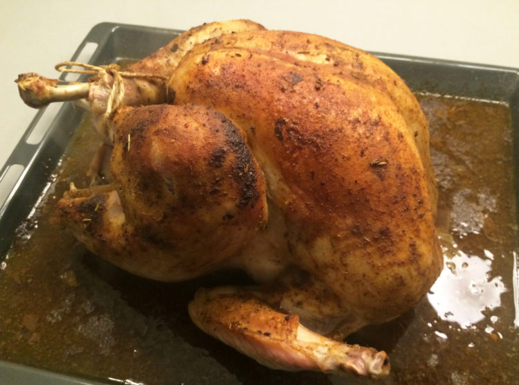 Das Backrohr auf 220 Grad vorheizen und den Truthahn für ca 25 – 30 Minuten braten. Anschliessend etwa 100 Gramm Butter zerlassen, den Truthahn aus dem Backofen holen, die Temperatur auf 180 Grad reduzieren und den Vogel mit etwas Butter bestreichen (dann wird die Haut besonders knusprig).