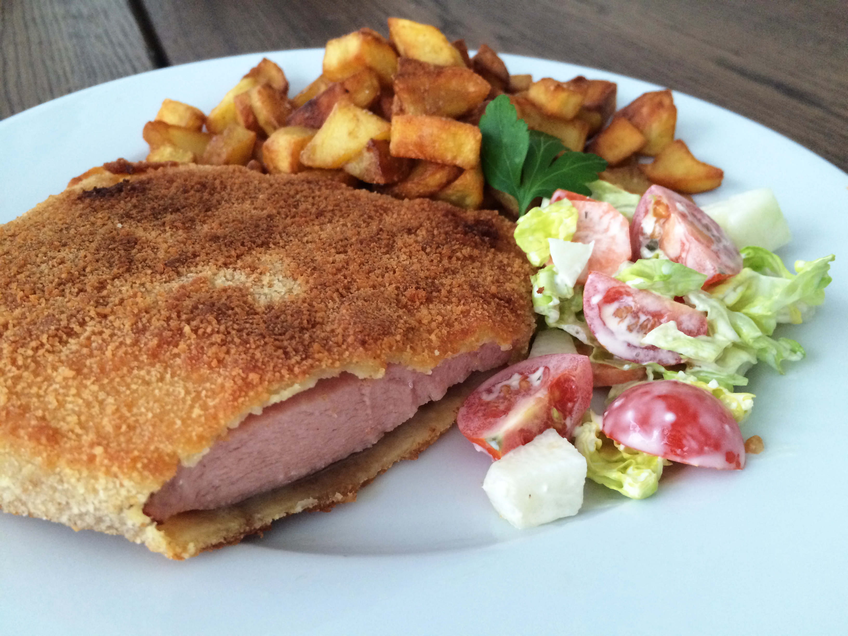 Mittlerweile sollten auch die Erdäpfelchen fertig sein. Jetzt einfach alles zusammen mit einem frischen knackigen Salat mit Mayonnaise Dressing auf einem Teller anrichten und noch heiss geniessen.